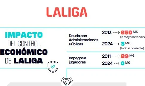 «El cumplimiento de estas normas es estricto. En caso de incumplimiento, LaLiga puede aplicar sanciones que van desde la imposibilidad de inscribir jugadores, hasta multas económicas. Gracias a esta disciplina, los resultados han sido contundentes: la deuda con las Administraciones Públicas, que en 2013 ascendía a 650 millones de euros, se ha reducido hasta solo 3 millones en 2024. Por su parte, los impagos a jugadores, que en 2011 superaban los 89 millones, se han eliminado por completo y actualmente son inexistentes».
