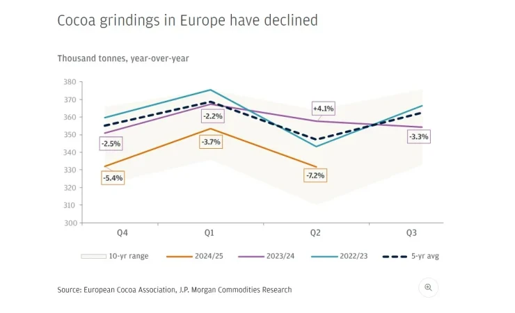 Los precios del cacao están cayendo debido a la menor demanda industrial, ya que los fabricantes se enfrentan a mayores costes y márgenes más ajustados, según una reciente nota de JP Morgan Global Research.