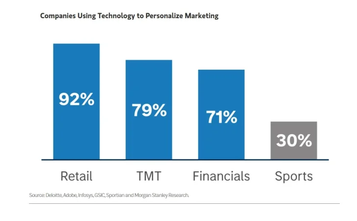 Como ejemplo del retraso en la digitalización de los deportes, solo el 30% de las empresas del sector utilizan herramientas tecnológicas para personalizar sus campañas de marketing. Es un porcentaje mucho menor que en el comercio minorista, donde el 92% de las empresas utilizan la tecnología para estas campañas.