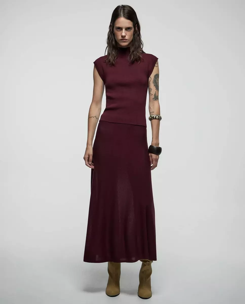El punto sigue marcando tendencia y este otoño se presenta como uno de los tejidos más buscados. Sfera lo sabe y por eso lanzó un conjunto burdeos formado por top (29,99 euros) y falda (35,99 euros), confeccionado en una mezcla de lyocell (70%), algodón (25%) y seda (5%).
