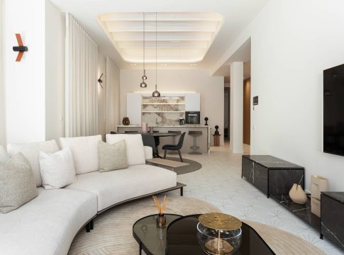 Situada en una finca señorial de nueva construcción, este apartamento de 154 m² ha sido diseñado para quienes valoran la armonía entre interiorismo y funcionalidad. El proyecto, también firmado por AtelierH, articula un salón-comedor con cocina integrada, dos dormitorios en suite, aseo de cortesía y tres baños en total.