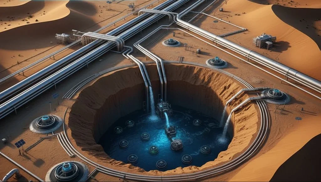El proyecto ha requerido una infraestructura logística sin precedentes: una red de tuberías de un metro de diámetro que recorre 160 kilómetros desde la costa hasta el corazón del desierto. Durante más de dos años, se ha bombeado caudal de forma ininterrumpida para llenar estos depósitos naturales. La monitorización es constante, controlando parámetros de salinidad y presión mediante sensores de última generación para asegurar que la «recarga artificial» se mantiene en condiciones óptimas para el consumo humano.