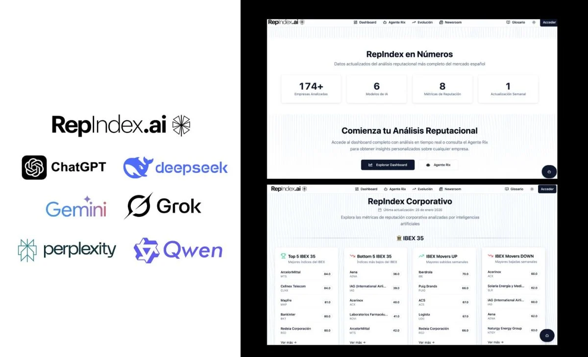 La reputación corporativa ha entrado en una nueva era con la hegemonía de la inteligencia artificial. REPINDEX.AI define, analiza y prospecta la reputación corporativa en tiempo real del IBEX-35 y del Corporate Spain; y representa la primera y única plataforma nativa de IA que cubre, integra y sistematiza los modelos ChatGPT, DeepSeek, Gemini, Grok, Perplexity y Qwen.