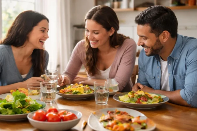 Otro punto clave: el ambiente. Porque no basta con poner comida saludable en el plato si la atención está en otro lado. Jessica lo dice sin rodeos: fuera pantallas durante la comida.