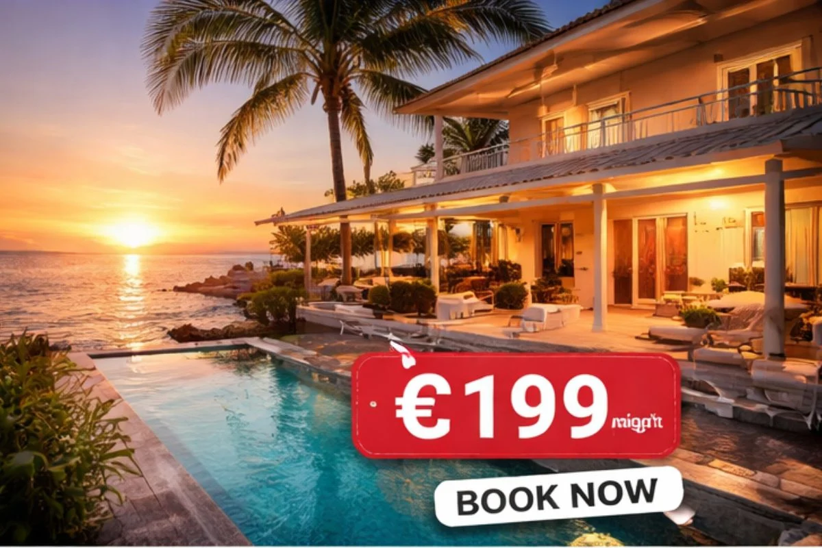 Una villa enorme. Piscina infinita. Vistas al mar. El sol cayendo sobre el agua con ese tono naranja que parece sacado de una postal.