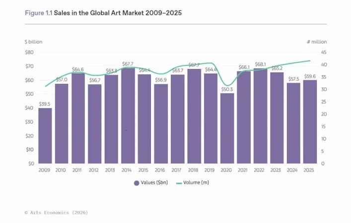 1. El mercado mundial del arte volvió a crecer en 2025, con un aumento interanual de las ventas del 4%, hasta alcanzar una cifra estimada de 59.600 millones de dólares. Aunque esto supuso un cambio positivo en la tendencia del mercado tras dos años consecutivos de caída de los valores, la recuperación fue moderada y desigual, lo que dejó al mercado por debajo de su máximo alcanzado en 2022.