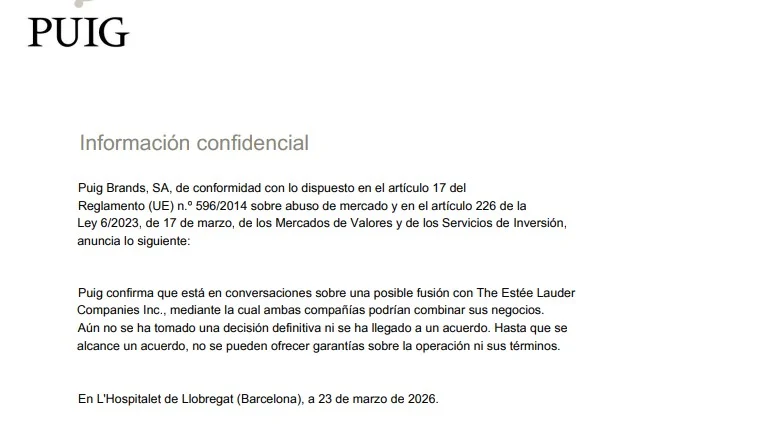 Tanto Puig como Estée Lauder confirmaron que están en posibles conversaciones sobre una posible fusión. No obstante, ninguna de las partes ha tomado una decisión definitiva ni se ha llegado a un acuerdo, lo que mantiene la incertidumbre. En cuanto a las acciones, el lunes 23 de marzo por la noche, antes de hacerse oficial esta operación, Estée Lauder cerró un 11% por debajo de su precio promedio de cotización, lo que reflejó la inquietud del mercado», añaden desde Deutsche Bank.