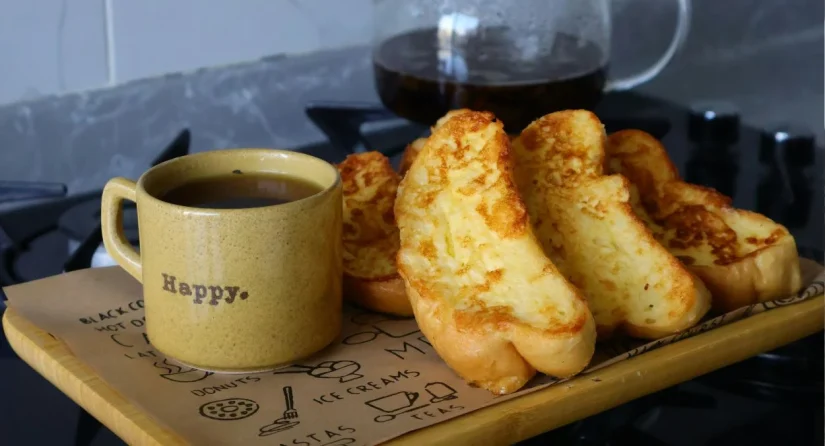 Después se cortan las rebanadas de brioche o pan dulce y se colocan dentro del bol con la mezcla ya caliente. El siguiente paso es dejarlas reposar, cubiertas con un plato, hasta que hayan absorbido bien toda esa leche aromatizada, y es ahí donde la torrija empieza a coger cuerpo de verdad.