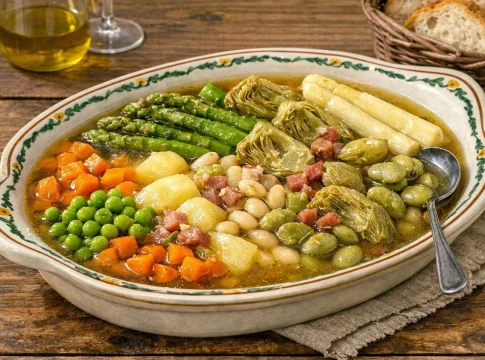 El brillo final del plato se consigue gracias a esa capa gelatinosa que une los sabores sin enmascarar la pureza de cada hortaliza individual. Es un ejercicio de equilibrio donde el aceite de oliva virgen extra actúa como el hilo conductor de toda la sinfonía vegetal de la ribera.