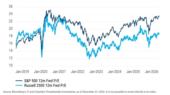 Sin embargo, a cierre de 2025, el Russell 2500 cotizaba a 18,5 veces en términos de PER adelantado a 12 meses, frente a las 23,0 veces del S&P 500, lo que implicaba una brecha cercana a 5 veces. Esta brecha de valoración se ha ampliado desde la pandemia, impulsada por la incertidumbre macroeconómica, la preferencia de los inversores por las mega caps y la extraordinaria capacidad de generación de beneficios de las mayores compañías, que ahora dominan los índices ponderados por capitalización.
