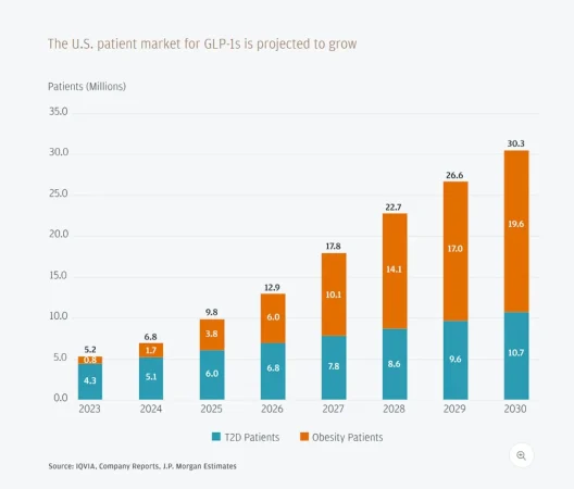 Se estima que más de 30 millones de estadounidenses recibirán tratamiento con GLP-1 en 2030 (un aumento de 10 millones con respecto a los que tomaban GLP-1 de marca en 2026), lo que convierte el crecimiento de los GLP-1 en uno de los temas clave a seguir en el nuevo año.