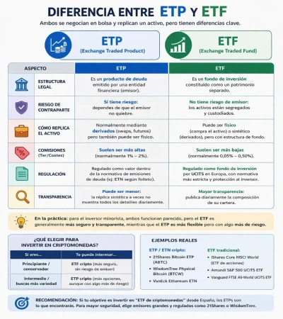 Como broche a todo esto que te contamos, y antes de pasar a las mejores plataformas para invertir en ETFs de criptomonedas en España, recuerda que -en la práctica- lo que venden como “ETF de Bitcoin” suele ser un ETP, normalmente un ETN (emisor promete replicar el precio de BTC). El problema en ese caso es que hay riesgo de contrapartida, por muy parecido a un ETF que resulte.
