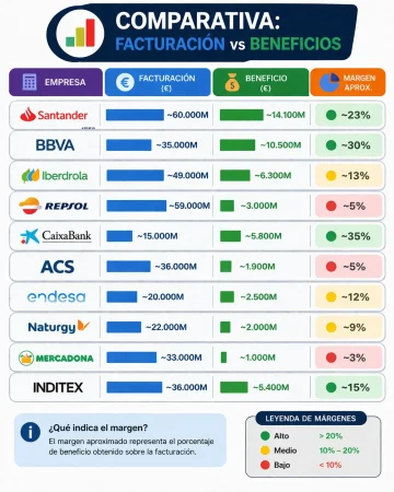 Así, podemos decir que el sector bancario es el principal motor de beneficios en España y que representa gran parte del crecimiento reciente. Le siguen energía, muy fuerte en facturación, pero con menor margen que la banca, telecomunicaciones, distribución y construcción de infraestructuras.
