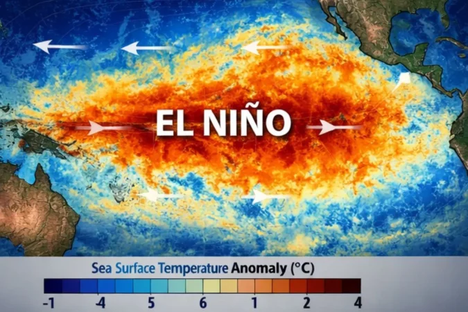 El Niño es, básicamente, un calentamiento inusual de las aguas del Pacífico ecuatorial. Suena técnico… pero imagina esto: es como si una gran masa de agua cambiara de humor y, al hacerlo, arrastrara consigo a la atmósfera.