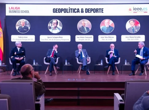 La primera mesa redonda, ‘Deporte y geopolítica’, reunió a perfiles de alto nivel como Juan Antonio Samaranch (vicepresidente primero del COI), Ignacio Cartagena (Casa del Rey), Federico Aznar (capitán de fragata de la Armada y Analista Principal del IEEE) y Javier Tebas, presidente de LaLiga, que analizaron el papel del deporte como instrumento de ‘soft power’, su influencia en las relaciones internacionales y su papel en la construcción de narrativas globales.