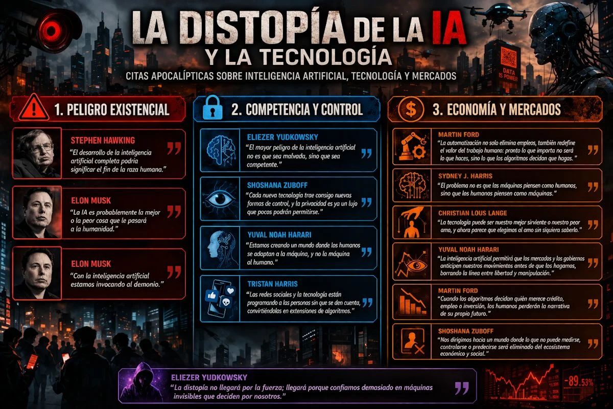 - “La distopía no llegará por la fuerza; llegará porque confiamos demasiado en máquinas invisibles que deciden por nosotros.” Eliezer Yudkowsky