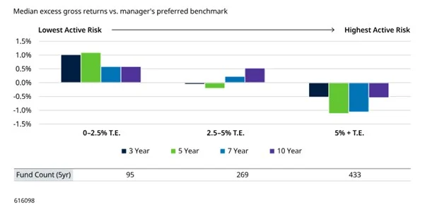 Mientras que los gestores con tracking error bajos y moderados obtuvieron una rentabilidad similar en los 10 años, los gestores de riesgo activo más conservadores obtuvieron una rentabilidad significativamente superior en los periodos de 3, 5 y 7 años. La diferencia sería aún mayor si se tuvieran en cuenta las comisiones.