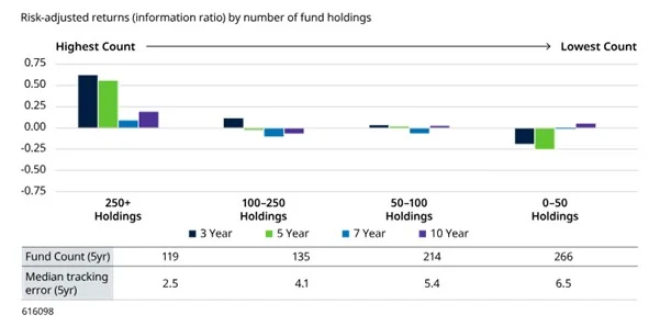 En términos más generales, a menudo se considera que las carteras concentradas están correlacionadas con mayores rentabilidades extras, ya que el tamaño de la posición es sinónimo de convicción. Sin embargo, al menos durante la última década, ha ocurrido lo contrario. Como muestra el gráfico 2, las carteras con más posiciones —en el rango de 250 o más— obtuvieron una rentabilidad significativamente superior a la de las estrategias más concentradas en términos ajustados al riesgo.