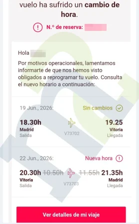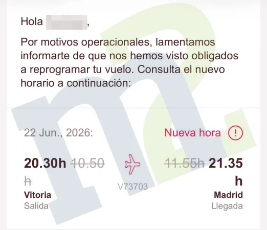 De momento, la primera confirmación es de un vuelo entre Vitoria y Madrid para el próximo 22 de junio. Los usuarios afectados han recibido el mensaje digital a través de su correo electrónico, donde la empresa no daba una explicación directa de los motivos para el cambio de horario. «Por motivos operacionales, lamentamos informarles que nos hemos visto obligados a reprogramar su vuelo», es toda la explicación que se ofrece a los usuarios, aunque la preocupación es que este tipo de mensajes se hagan más comunes una vez que se vayan acercando los momentos de más movimiento en la temporada estival.