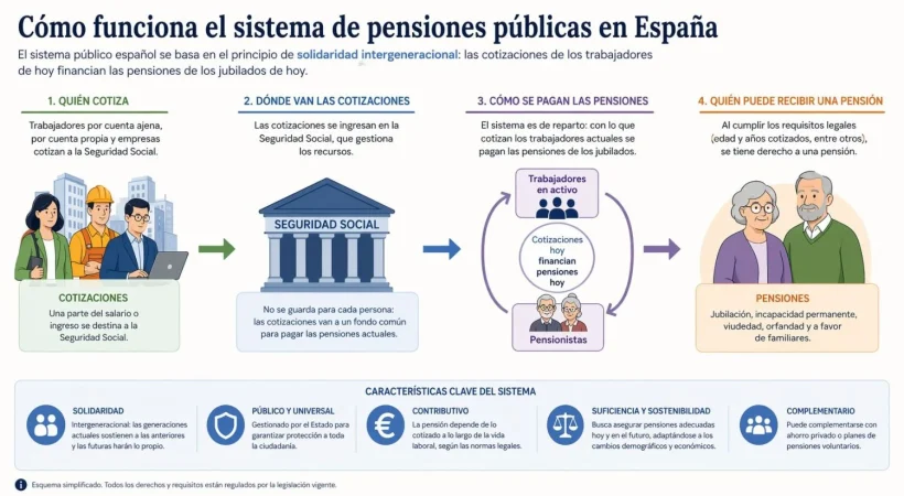 El sistema de pensiones públicas en España es un modelo de reparto y solidaridad intergeneracional. Esto significa que las cotizaciones de los trabajadores actuales no se guardan en una cuenta personal para su futuro, sino que se utilizan para pagar las pensiones actuales.