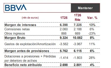 «La menor aportación de los ingresos por operaciones financieras explicaría principalmente un descenso de la línea de otros ingresos, -23% interanual«, certifican desde Renta 4. Asimismo, estos datos llevan a la entidad a un margen bruto de 10.082 millones de euros, una generación de ingresos que permitirá compensar el incremento esperado tanto en los gastos de explotación como en las provisiones, alcanzando un beneficio neto en el primer trimestre de 2026 de 2.801 millones de euros.