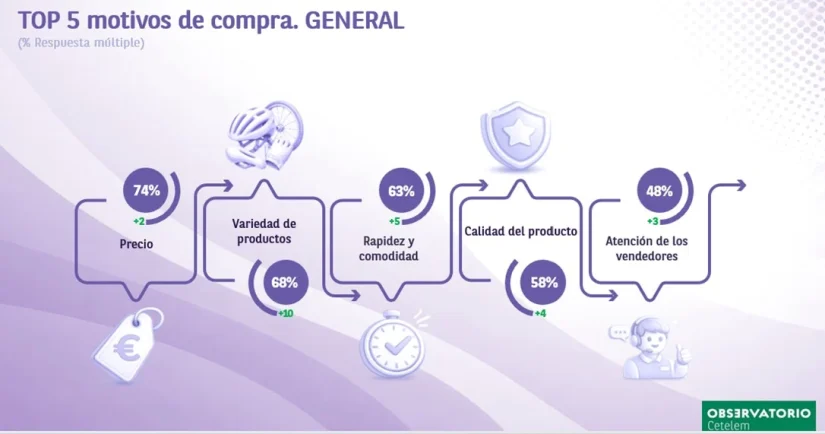 El precio continúa siendo el principal motor de decisión en la compra (74%), seguido por la variedad de productos (68%) y la rapidez y comodidad (63%), lo que explica el crecimiento del ecommerce. Sin embargo, factores como la calidad del producto (58%) y la atención del vendedor (48%, más 3 p.p respecto a 2025) siguen siendo determinantes en tiendas físicas especializadas.