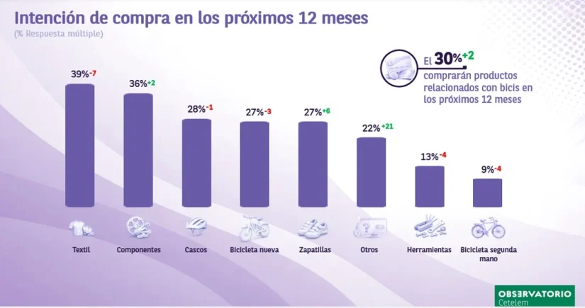 Por su parte el gasto medio en productos relacionados con el ciclismo alcanza los 632 euros en los últimos 12 meses, frente a los 604 euros registrados en 2025. Este crecimiento se apoya en un mayor dinamismo de la demanda, ya que el número de compradores también aumenta. Entre las categorías más adquiridas destacan el textil (54%), los componentes (53%) y los cascos (48%), seguidos por la compra de bicicletas nuevas (38%), que gana peso frente al año anterior.