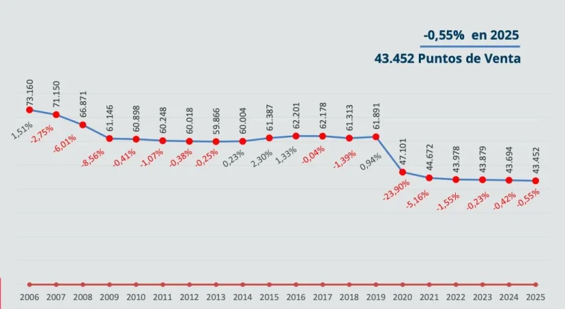 Pasando a los cierres, la presencia de puntos de venta se ha reducido un 0,55 %. Durante 2025 se han cerrado 242 locales, siendo esta una cifra neta, lo que refleja que actualmente hay 43.352 puntos de venta. Desde 2019 se han cerrado alrededor de 18.000 comercios, lo que muestra la pérdida de peso de los establecimientos físicos y las consecuencias del auge de las plataformas de comercio electrónico, como Shein y Temu.