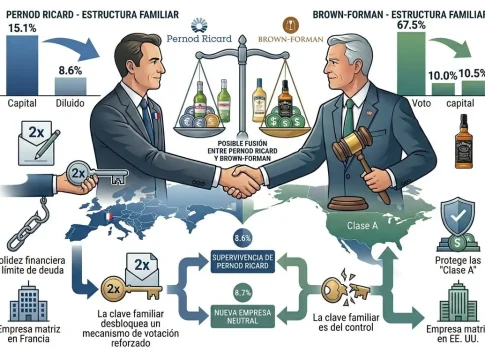 En general, si bien la familia Ricard aún podría mantener una participación accionaria significativa, su flexibilidad financiera parece más débil. «Si la dilución redujera su influencia en un grupo combinado, podría carecer de la capacidad para recuperar el control, lo que hace aún más importante la preservación de los derechos de voto dobles», apuntan los expertos.
