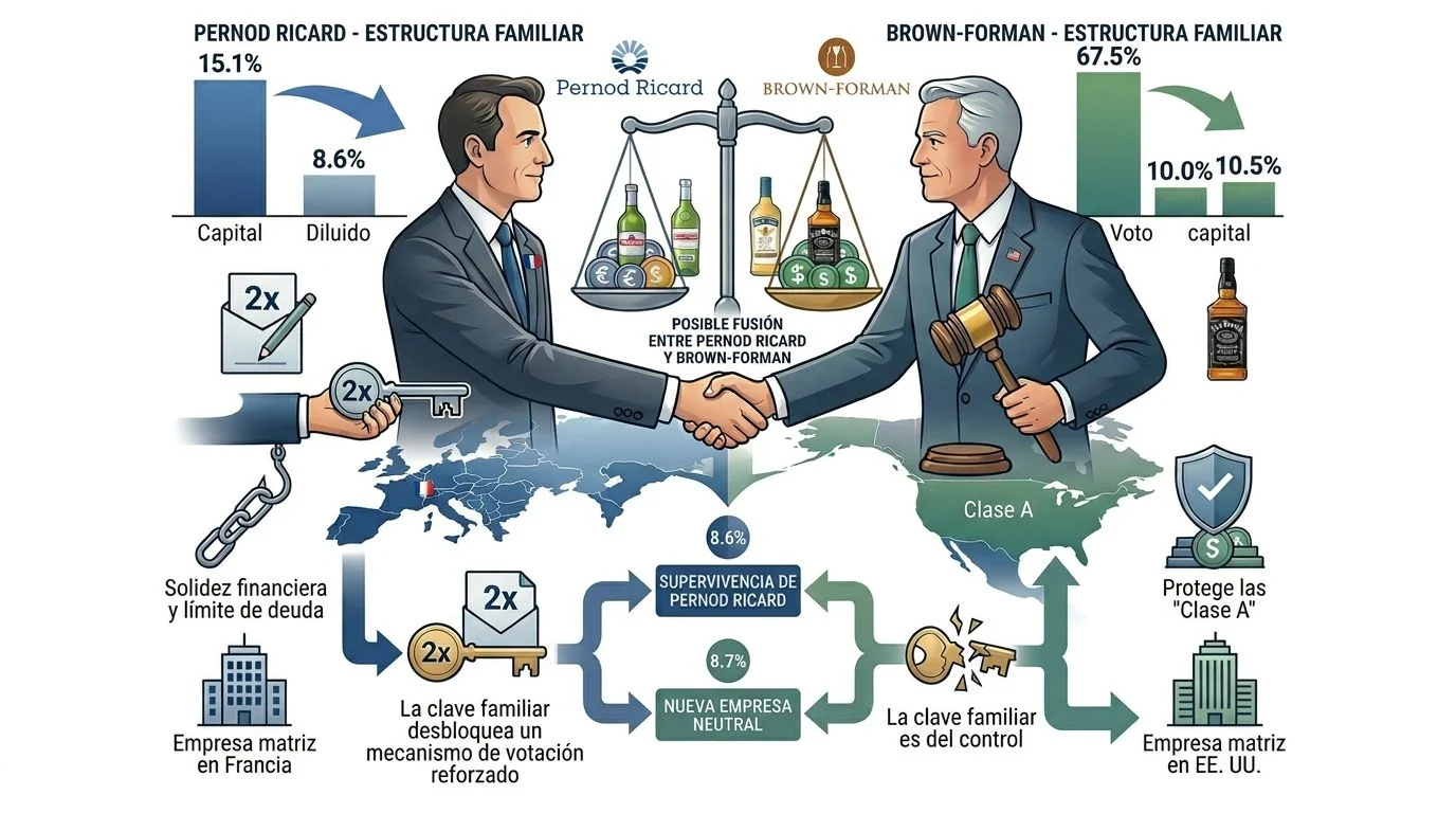En cuanto a Brown-Forman, opera bajo una estructura favorable a la familia. Solo las acciones de Clase A tienen derecho a voto, y los principales vehículos familiares poseen el 67,5% de esta clase, funcionando como una empresa familiar controlada. Una empresa matriz francesa no replicaría naturalmente este marco. El problema no radica en la nacionalidad de la matriz, sino en la posible pérdida de control para una familia.