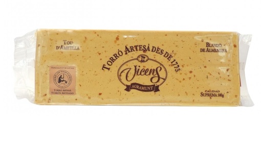 El primer producto que veremos es este turrón blando de almendras. Eso sí, no se trata de uno cualquiera, sino uno artesano de la exclusiva marca Vicens, la cual lleva varios siglos haciendo turrón de esta manera. Simplemente lleva almendra, jarabe de glucosa, azúcar, miel y clara de huevos, sin ningún aditivo.