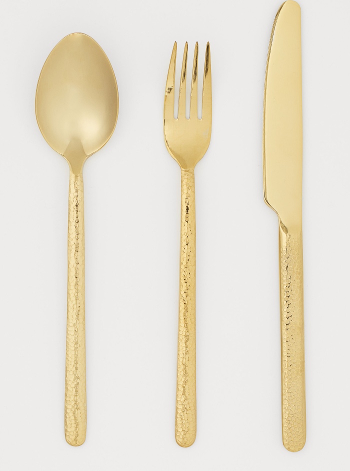 Los cubiertos dorados son la última tendencia. Es por eso por lo que han añadido varias colecciones a las tiendas de decoración como, por ejemplo, en H&M Home. Una de esas colecciones es este pack de 3 cubiertos compuesto por un tenedor, una cuchara y un cuchillo de color dorado en metal amartillado. Una auténtica joya.