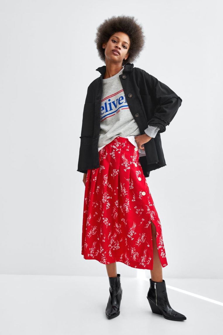 Nos encanta la falda midi de flores. Pertenece a la nueva colección y tiene un precio de 25,95 euros, pero, ¿Por qué han decidido realizar esta combinación? No es un look demasiado acertado y es que, mientras que la falda tiene un toque veraniego e incluso primaveral, la sudadera, la chaqueta y los botines corresponden a otra época del año. Vamos, que es uno de esos looks que pocas personas se atreverían a llevar.