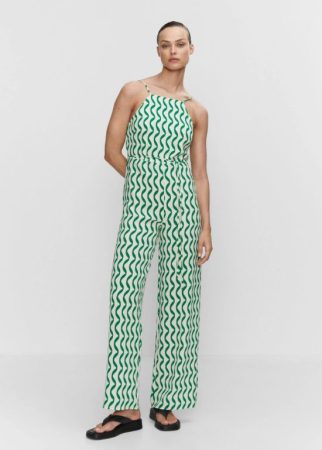 El catálogo de la web de Mango ofrece este mono de estampado geométrico en color verde y blanco que recuerda a la estética de los años 70. Esta pieza tiene un corte o diseño recto con escote tipo halter acompañado de unos tirantes finos que podrás ajustar a la medida que mejor se adapte a ti. Además, tiene una pequeña abertura en la espalda que hace a esta prenda todavía más especial. Incluye un pequeño cinturón decorativo. Puedes encontrar todas las tallas por 39,99 euros.
