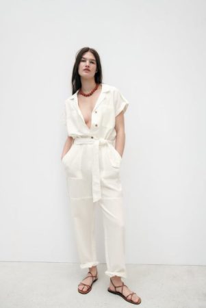 Esta opción de Zara es la definición de frescura ya que al estar compuesto por un 53% de lino y un 47% de algodón podrás mantenerte fresca en esos calurosos días de verano. Lo más característico de este mono es el cuello con solapa y escote en pico que le da un aire elegante a la vez que casual. Tiene un cierre frontal de botones en la parte superior y de cremallera en la inferior. El valor añadido de esta prenda es que tiene bolsillos laterales un cinturón compuesto de la misma tela que el mono y bolsillos frontales a la altura del pecho.