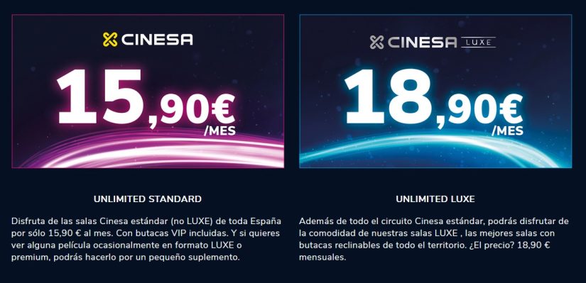 - Unlimited LUXE. Pagando 18,90 euros al mes, el suscriptor puede acceder no sólo a las salas estándar, sino también a las salas LUXE de Cinesa, con las ventajas que esto conlleva. Por ejemplo, butacas reclinables.