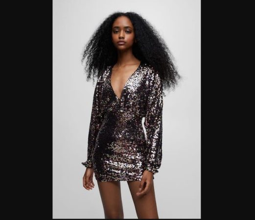 Disfruta de la elegancia y el glamour con este vestido corto de lentejuelas de manga larga japonesa de Pull & Bear, el cual tiene un costo de 12,99 €. Está confeccionado con un tejido con 95% poliéster y 5% elastano para asegurar comodidad y libertad de movimiento. Cuenta con un escote en pico cruzado y una falda ajustada para un look moderno y sofisticado.