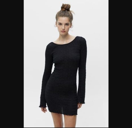 ¡Este elegante vestido corto de tejido efecto arrugado de Pull & Bear es una prenda de moda imprescindible para completar tu armario! El vestido se presenta con una manga larga ligeramente acampanada, una espalda escotada con cordón y una cintura ajustada.
