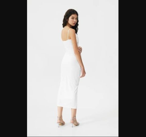 ¡Luce mejor este verano con el vestido midi con escote drapeado que ofrece Pull & Bear! Nuestro vestido midi con escote drapeado es una prenda perfecta para cualquier ocasión de verano. Este hermoso vestido está fabricado con un tejido ligero y suave para una comodidad máxima. El escote drapeado y los tirantes finos le dan al vestido un toque moderno y refinado.