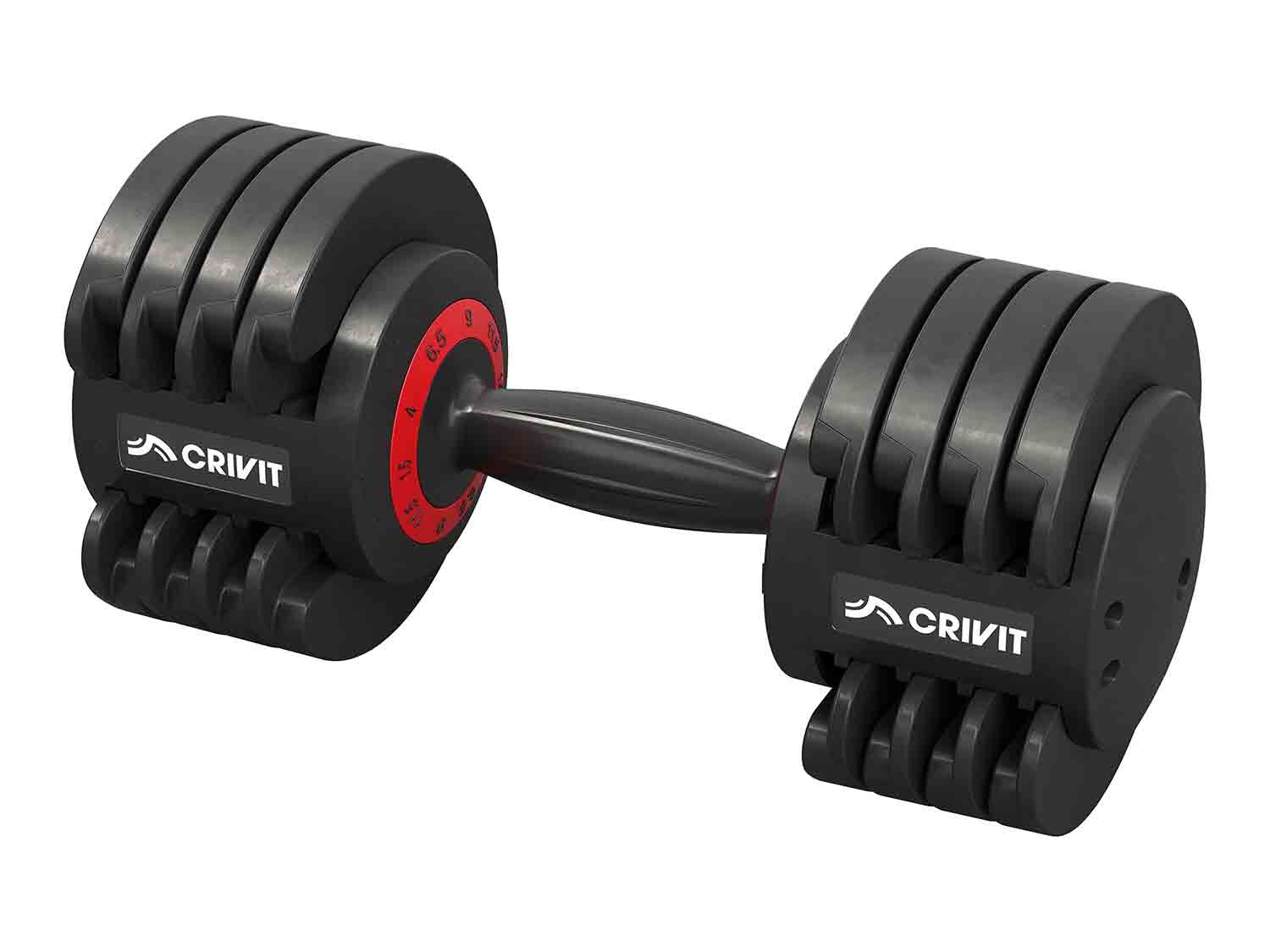 Puedes ponerle desde 1,5 kilos hasta 11,5, añadiendo 1,5 kilos en cada nivel. Viene con una base para regular y apoyar la mancuerna, la cual tiene superficie antideslizante. De este modo, tendrás varias mancuernas en una sola, sin ocupar demasiado espacio y sin tener que sacar y poner discos. El precio del producto es de 89,99 euros, pudiendo financiarlo hasta en 36 meses.