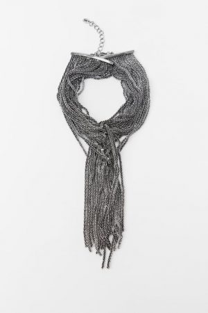 Este choker o gargantilla es uno de esos accesorios diseñados para elevar cualquier look a un nivel superior de sofisticación. Es de latón, zinc y hierro, de color plata, compuesto de multitud de cadenas que caen en cascada en la parte de delante. Cierra con mosquetón en la nuca. Es perfecto para combinar con prendas básicas, para darle todo el protagonismo, y queda fenomenal tanto sobre un jersey oscuro como con un vestido de fiesta. Puedes tenerlo en casa por 29,95€.