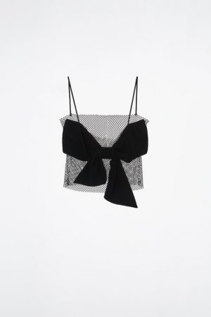 Otro top espectacular de Zara es este modelo confeccionado en tejido tipo malla, hecho en poliéster y elestano. Tiene el escote recto, tirantes finos, y un llamativo lazo de terciopelo negro en la parte de delante. Es una pieza que se puede combinar sobre un top de fiesta, un jersey, un vestido, un peto… Las opciones son muchas, solo tienes que dejar volar tu imaginación. Puedes llevártelo por 35,95 €.