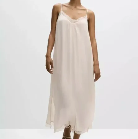 - Vestido midi con detalles de encaje — 22,99 €. Corte midi y longitud ideal. El encaje añade feminidad, mientras que su caída lo hace apto para el calor. Combínalo con sandalias planas y un bolso de rafia para cenas veraniegas. Puntos clave destacados: vestido midi, encaje, fresquito.