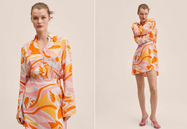 Comenzamos con este vestido que triunfa en Mango, así que date prisa porque se puede agotar totalmente o al menos algunas de las tallas. Se trata de un modelo estampado con tejido fluido, diseño evasé, en corto, con cuello camisero, shirt dress, manga larga, cierre delantero y sin forro interior. Está disponible también en Plus. Está fabricado 100% en viscosa y el forro 100% en poliéster. Su precio es de 39,99 euros.
