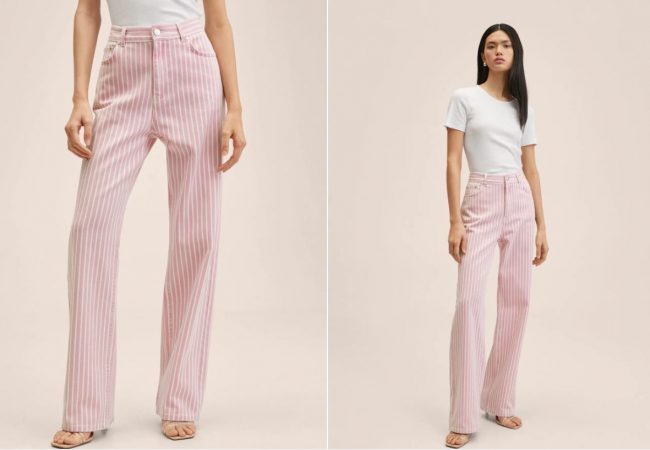 Fíjate que pantalón tan perfecto para esta primavera y verano, para lucir en vacaciones, en paseos por zona costera, con ese aire marinero y en ocasiones especiales. Es elegante y fresco. Son unos jeans rectos a rayas en tejido de algodón estilo denim, diseño largo y recto, tiro medio, con estampado de rayas. Cuenta con cinco bolsillos, trabillas, y cierre de cremallera y botón. Su precio también es de 39,99 euros.