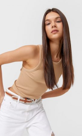 Este modelo de cinturón trenza cuerda, es otro de los clásicos para el verano que te traen las tiendas Stradivarius para este caliente verano. Ideal para usarlo en cualquier pantalón que uses en este verano, tambien lo podrás lucir con un short. Viene en un hermoso color caramelo claro será tuyo por tan solo 9.99 euros. Viene elaborado con poliuretano en un 70% para la parte central del cinturón y un 30 por ciento de fibras de algodón utilizadas para la cuerda trenzada. Con hebilla metálica para mayor facilidad al colocarlo.