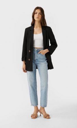 Con este blazer abierta doble con botonadura, tendrás la posibilidad de incorporar una pieza increíble de Stradivarius que viene de cuello solapa y manga larga. Es importante decir que sus bolsillos son de doble vivo en delantero, y además tiene cierre frontal cruzado con botones. El color negro como es costumbre se impone en este ámbito, y lo viene a hacer para marcar tendencia.