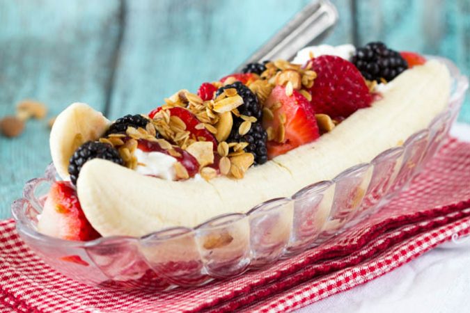 Este es uno de esos postres que vemos en las películas y que entra por los ojos de forma espectacular por su mezcla de colores y texturas. Si bien la receta original puede ser una bomba de calorías, existe una versión light que convierte al banana split en un postre sano y delicioso.