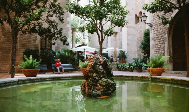 Este patio fusiona arte y arquitectura gótica para deleitar tu vista mientras tomas un café, o lo que te apetezca.