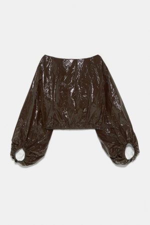 Comenzamos este recopilatorio de las prendas más feas que encontrarás en Zara, con este modelito… Una camisa corta de escote recto y manga abullonada y detalle de tejido efecto arrugado en color marrón que parece una bolsa de basura.